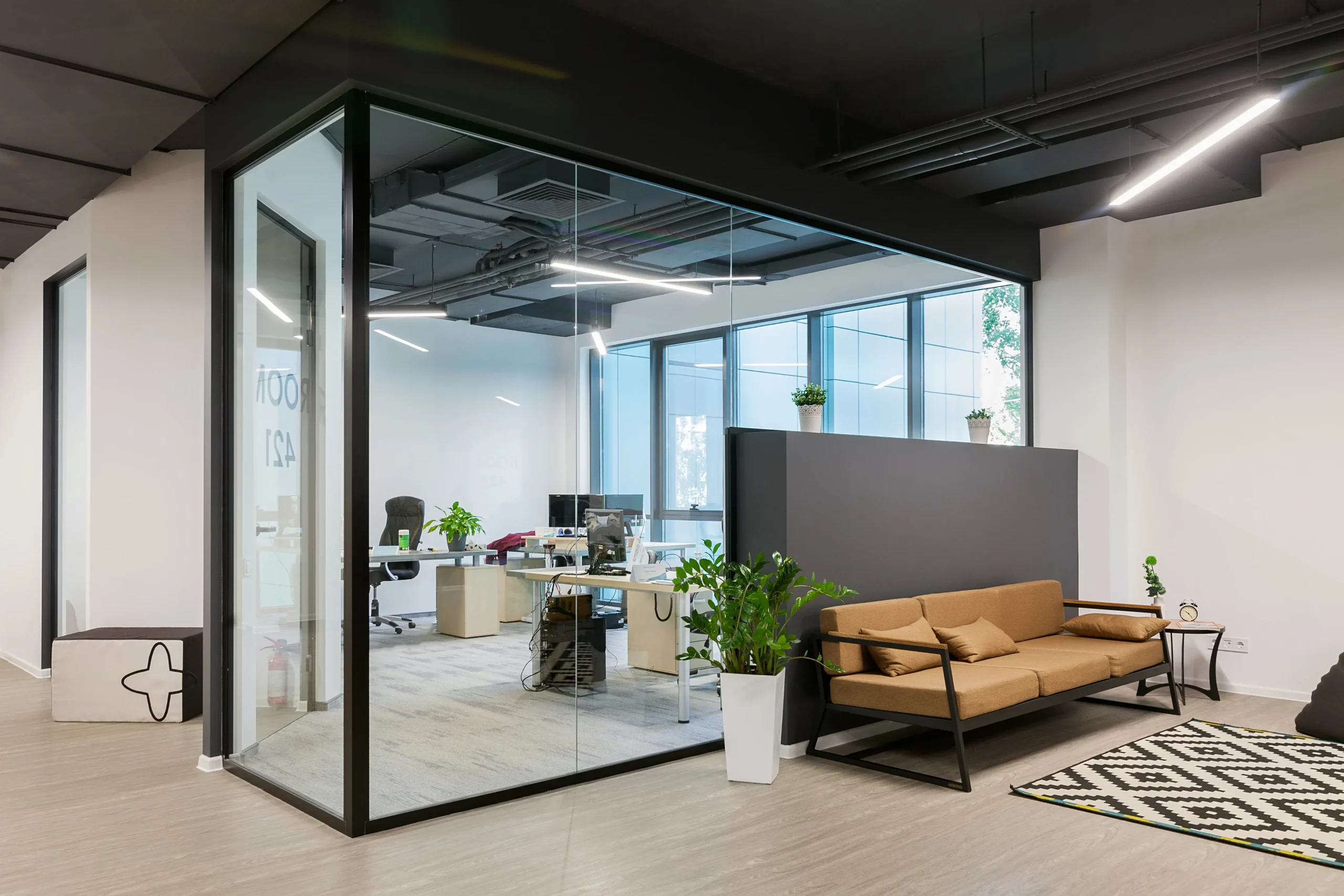 Office glass partitions and meeting room systems used to define spaces while maintaining light and openness.